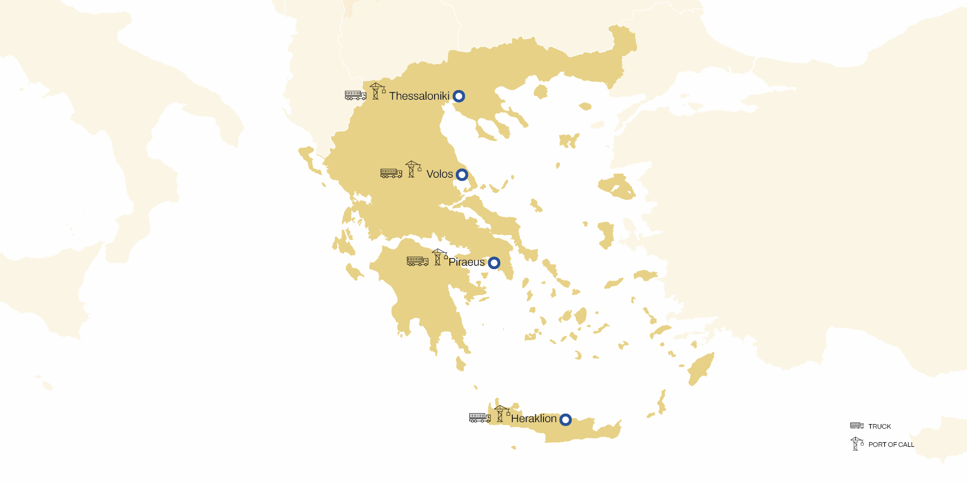We are the only shipping line in Greece serving the ports of Volos and Heraklion with regular weekly connections.